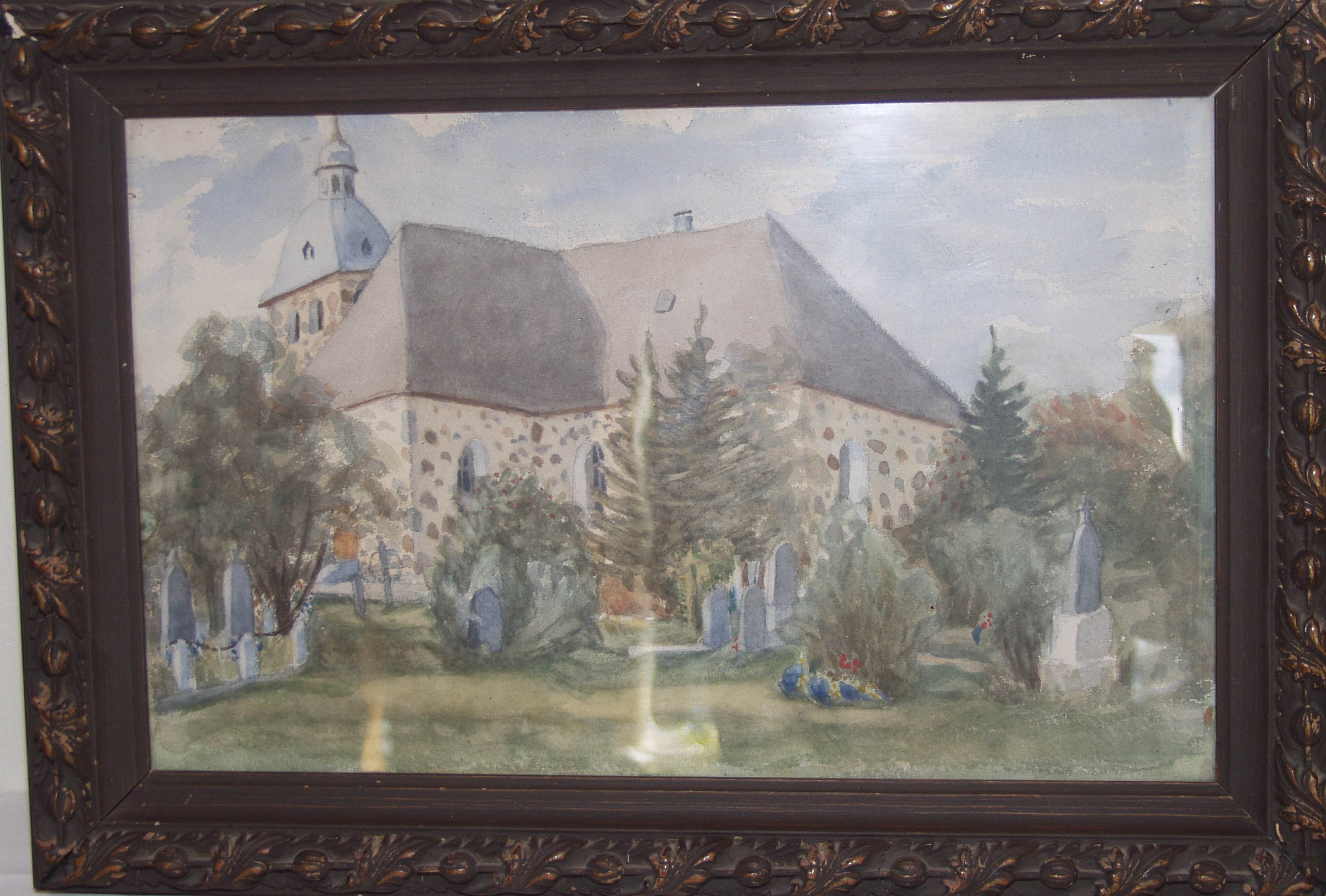 Kangasalan kirkko. "Olli ja Ulla Joutsiniemelle, Jumalan siunausta toivottaen muistoksi kiitolliselta Kainolta. Maalasin parina syyskesän aamuna muist. 1920 "