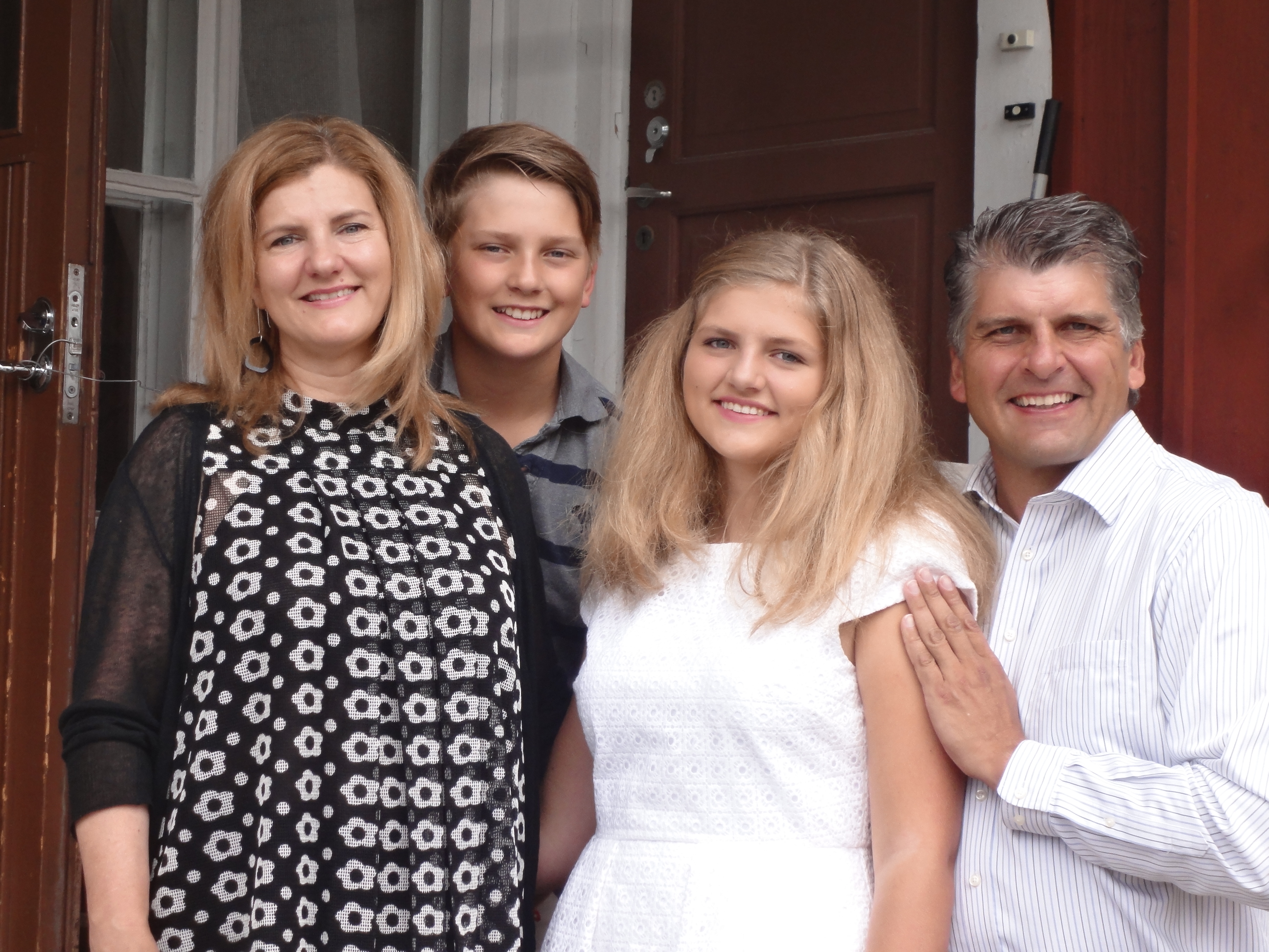 Kim, Marko, Anna-Maya ja  Jouko perhekuvassa rippijuhlan jälkeen Espoossa 1.8.2016